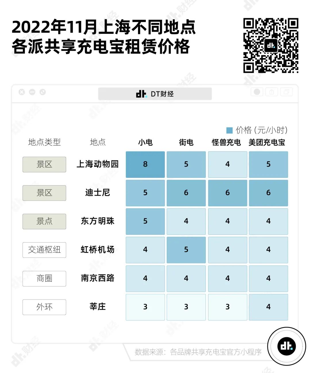 我们随机选择了上海几个不同地点(包括景区、交通枢纽、商圈、外环)的充电宝点位,并统计了四家头部共享充电宝品牌的收费。