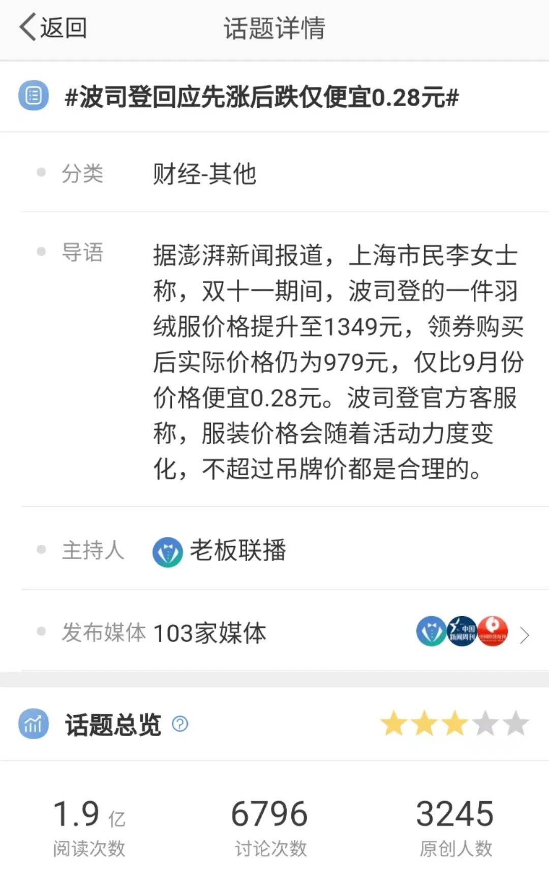 “波司登回应先涨后跌仅便宜0.28元”的话题很快成为热搜话题,截至目前累计1.9亿次阅读,6796次讨论。