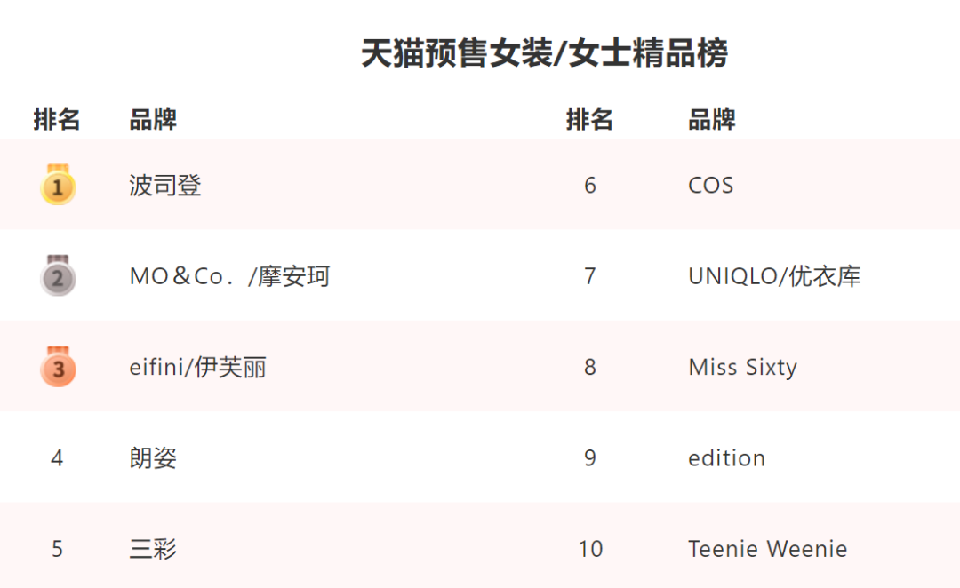 有意思的是,微博上争议不断的波司登,在双11中的表现却可圈可点。在天猫女装类目下,波司登的预售额排名第一,为6078万元,均价更是达到了1500元以上。此外,其在天猫、抖音第一波售卖期女装榜中均排名第二。