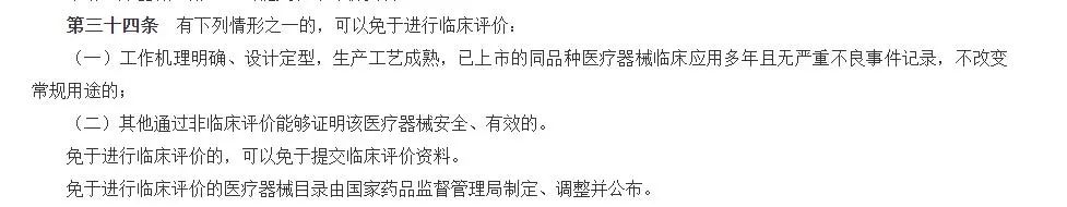 此外,根据国家发布的相关法规,二、三类医疗器械除了可以明确工作机理、生产工艺成熟,已上市的同品种医疗器械临床应用多年且无严重不良事件记录,不改变常规用途的,以及可以通过其他非临床评价证明该医疗器械安全、有效的,可以免于提交临床评价,而其余情况下的申请应当按规定进行临床试验。