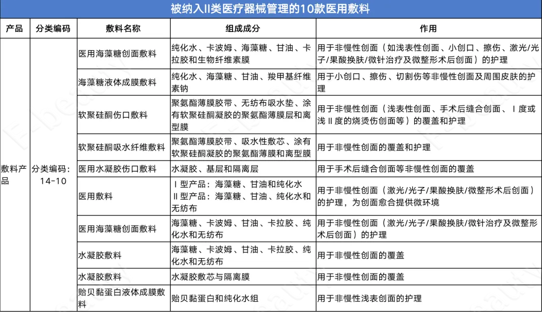 经《未来迹Future Beauty》梳理发现,此次被建议纳入II类医疗器械管理的产品共计12款,其中10款为医用敷料产品。其中,经常被用于激光/光子/果酸换肤/微整形手术后护理的“医用海藻糖创面敷料”也在其中。