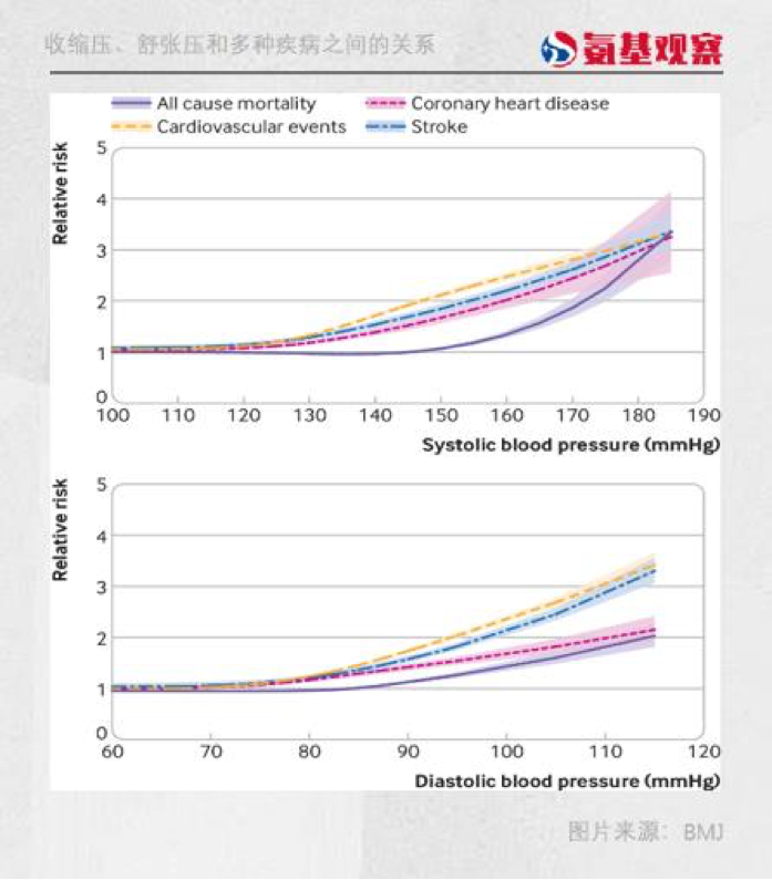 根据《BMJ》上的一项研究,收缩压高于129mmHg以上人群,发生心血管问题、冠心病、中风的风险逐渐增加。