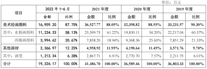 招股书显示,公司主要产品由美术绘画颜料及其他画材构成。美术绘画颜料包括水粉画颜料、丙烯画颜料,报告期公司美术绘画颜料收入占主营业务收入的比例分别为90.30%、88.55%、88.05%和87.75%,系主要的收入来源,此外公司还兼具画笔等其他画材产品销售。