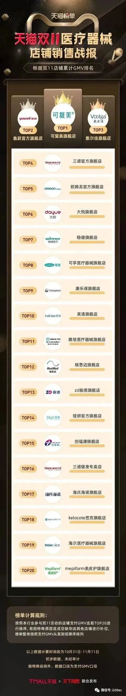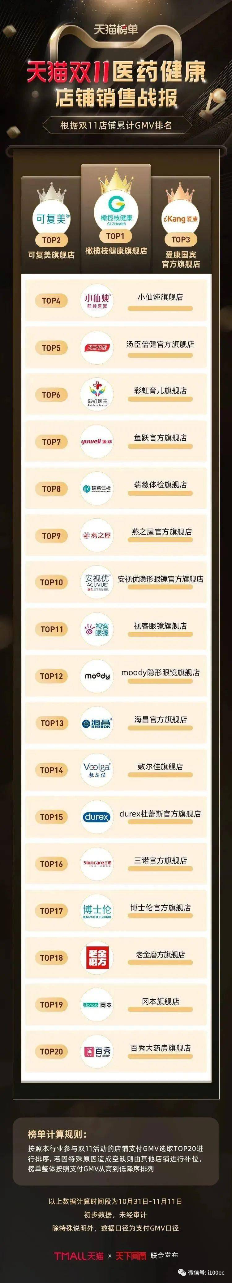 天猫双11店铺销售战报显示,在医药电商领域,橄榄枝健康登顶,可复美第二,爱康国宾获季军,前十中,还有小仙炖、汤臣倍健、彩虹育儿、鱼跃、瑞慈体检、燕之屋、安视优隐形眼镜等。