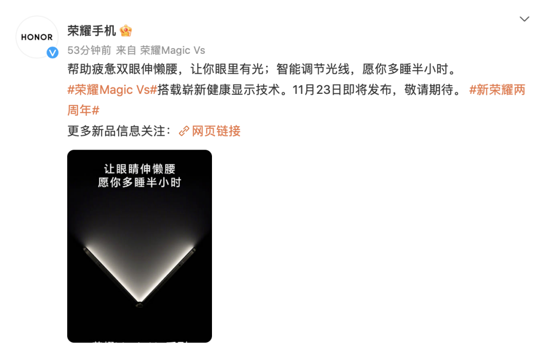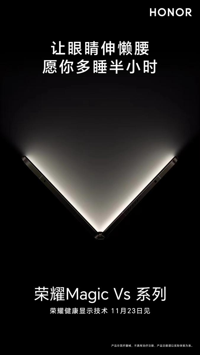 与此同时,从用户实际需求和应用场景出发,全力提高智能设备的护眼能力,助力消费者保护眼部健康、提升睡眠质量,荣耀也会用创新科技实力为用户带来健康的智慧使用新体验。可以预见,荣耀Magic Vs将实现生产效率和应用体验的双重飞跃。敬请期待11月23日的荣耀Magic Vs系列新品发布会。