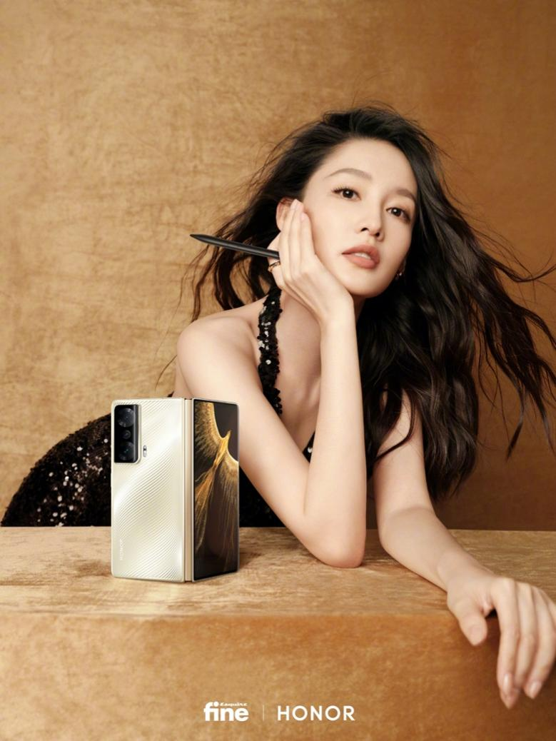 外观设计方面,在公布的李沁手持时尚大片中依旧让人眼前一亮。从大片中可以看出,荣耀Magic Vs外观上延续竖排三摄模组设计。在配色方面,一直对时尚格外敏感的色彩选择和极具前瞻性的审美眼光的荣耀,此次更是推出了低调奢华的金色设计,沉稳大气,又将引领科技工艺新风潮。