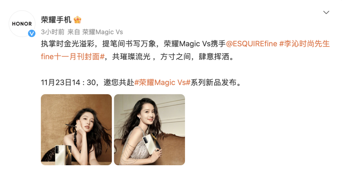 11月15日官方继续公开产品新亮点:新一代折叠屏将携业内首创健康显示技术面世;李沁携荣耀Magic Vs登《时尚先生fine》封面大片,新机外观首曝光。荣耀Magic Vs将以硬实力对折叠屏使用痛点逐个击破,外观以全新工艺设计演绎,内外双修,为消费者带来全新的折叠屏升级体验。
