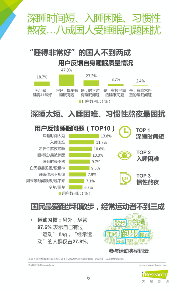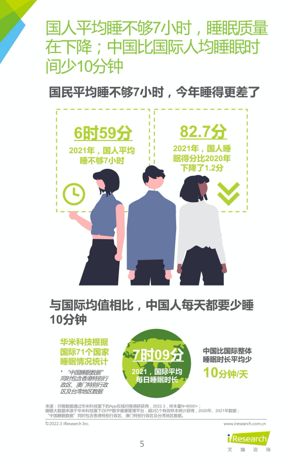 睡眠问题关乎人类生存质量和社会质量。据《中国睡眠研究报告(2022)》显示,2021 年中国民众睡眠指数为 64.78 分(百分制),仅略高于及格水平。过去的十年里,国人的平均入睡时间向后延迟了两个多小时,睡眠平均时长从2012年的8.5小时缩减到2021年的7.06小时,仅有三成国人能够获得八小时的充足睡眠。越来越多的人不仅难以保持规律睡眠,甚至还出现熬夜成瘾、浅眠多梦、视力下降等问题。由此可见,我国居民的总体睡眠状况一般,睡眠问题亟待有效解决。
