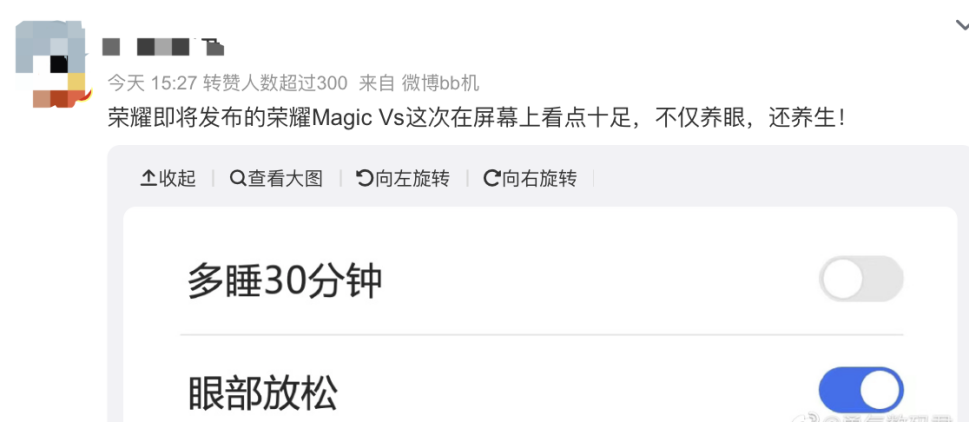 而手机可以说是睡眠的“温柔杀手”,不少人都有睡前玩手机的习惯,觉得能帮助睡眠。其实玩手机对睡眠影响非常大,无论是新闻热点、明星八卦还是晒旅游晒美食的“凡尔赛”朋友圈,都会对大脑产生刺激而减轻睡意。荣耀Magic Vs此次发布的助眠显示技术“让眼睛伸懒腰,愿你多睡半小时“,可以预见荣耀将在健康显示技术将在护眼和睡眠两个层面升维进化,给用户更健康的守护。此前外围早已有不少博主爆料了这一新技术,并用“养眼又养生”来概括形容。