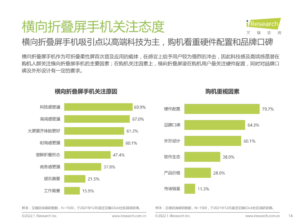 根据艾瑞咨询数据,横向折叠屏手机在感官上会给予用户较强烈的冲击,“科技感”及“高端感”是潜在购机人群关注的主要因素,同时潜在购机用户也较关注大屏展开使用体验、硬件配置、品牌口碑及外形设计;而纵向折叠手机的便携性成为吸引潜在购机人群的首要因素,潜在购机人群同样强调“科技感”、“时尚感”、“高端感”。