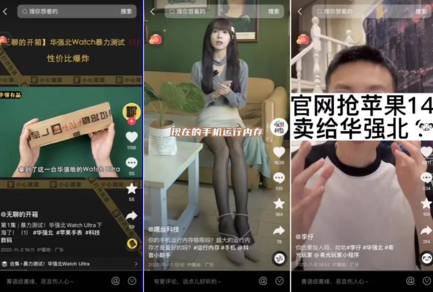 流量的不稳定,也让抖音的数码博主将焦虑直接传递到了内容。不少专营华强北仿货产品的博主凭借着低价,以及与苹果、华为高度相似的产品带货累积了不少粉丝。如头部华强北主播李仔,粉丝数133万,就是凭借着售卖二手以及代工厂产品在数码圈快速累积了第一波流量,期间也曾遭遇多次被打假、举报,但至今仍有许多博主跟风模仿其账号风格。