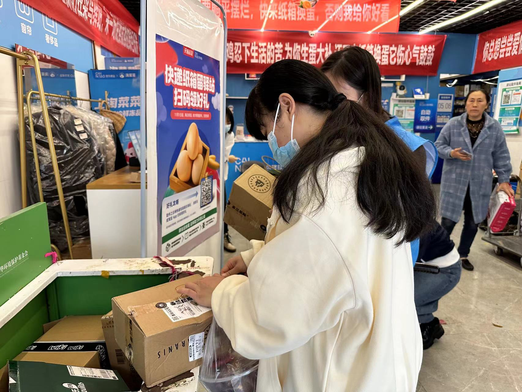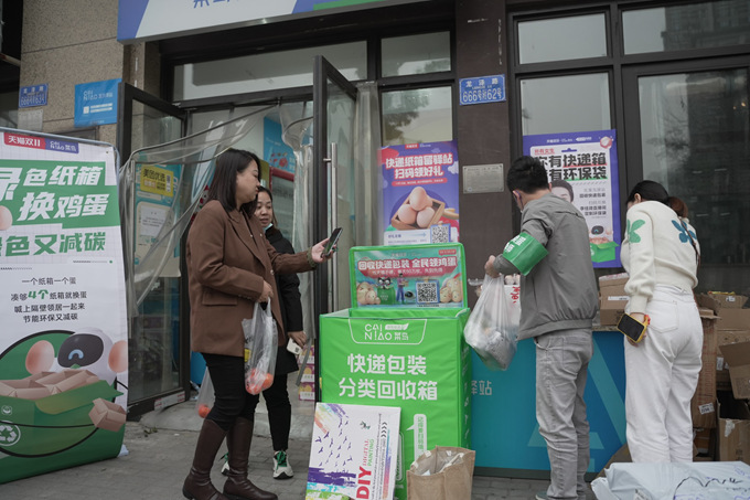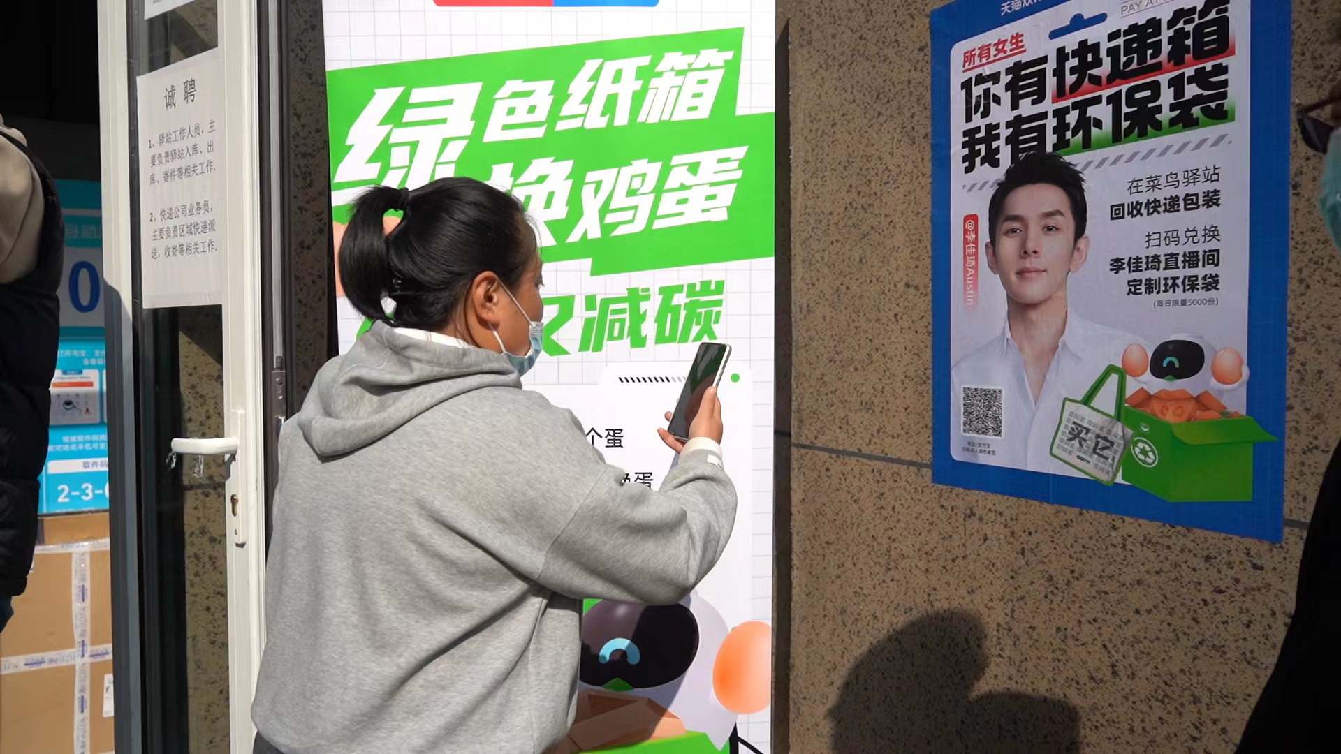 在全国深入县区的13万家菜鸟驿站里,“双十一”买家们拿着快递盒,通过驿站内的回箱扫码盒扫描快递盒上的条形码,可兑换相应数量的鸡蛋、获取绿色能量。“你想不想治疗精神内耗,欢迎随时找我唠唠,纸箱换蛋最可靠。”在成都,一位菜鸟驿站老板娘挂出这样的宣传标语。