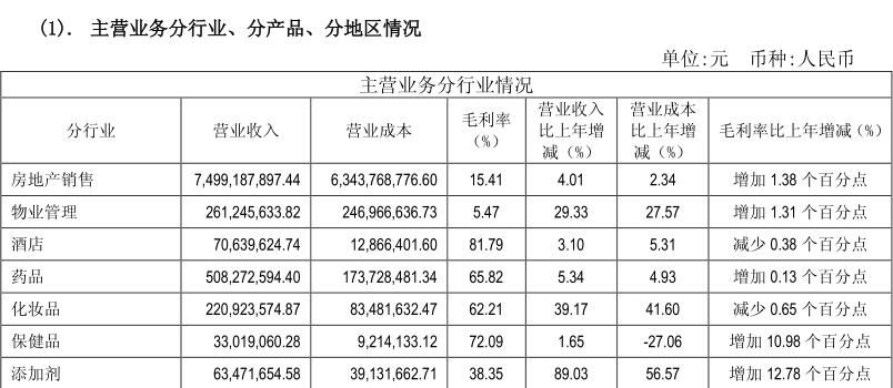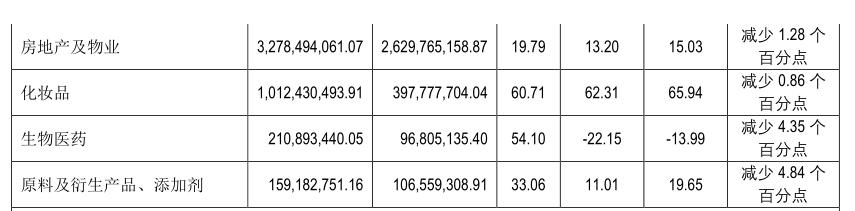 相比之下,前三季度生物医药板块实现收入19.98 亿元,同比增长27.67%;化妆品业务实现收入14.29亿元,同比增长43.91%,其中“颐莲”品牌实现收入5.40亿元,“瑷尔博士”品牌实现收入7.45亿元。值得一提的是,前三季度化妆品板块的毛利率高达58.56%,远超房地产及物业板块的19.79%(参考半年报数据)。