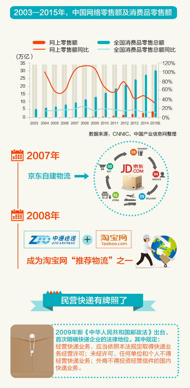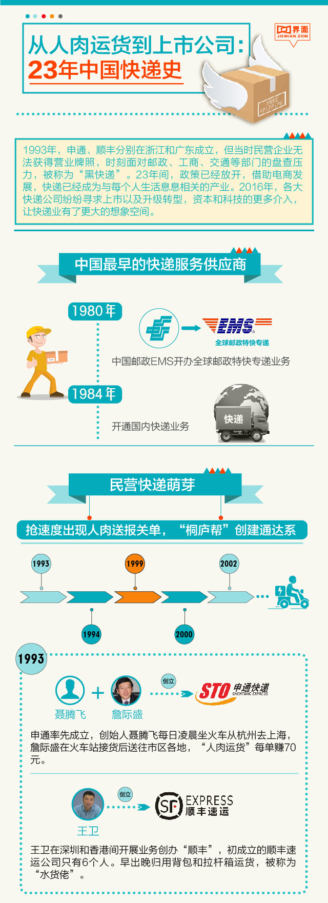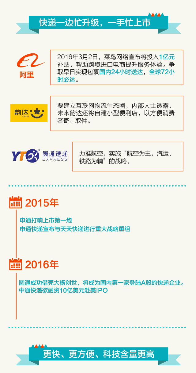 1993年,申通、顺丰分别在浙江和广东成立,但当时民营企业无法获得营业牌照,时刻面对邮政、工商、交通等部门的盘查压力,被称为“黑快递”。23年间,政策已经放开,借助电商发展,快递已经成为与每个人生活息息相关的产业。2016年,各大快递公司纷纷寻求上市以及升级转型,资本和科技的更多介入,让快递业有了更大的想象空间。