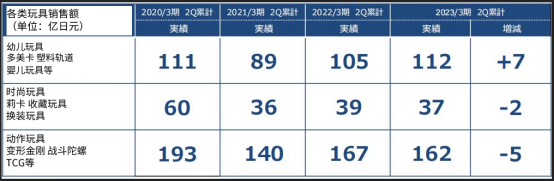 文创潮再来看看多美的各种类玩具销售情况,动作玩具销售额最高为162亿日元,同比下降5亿日元;幼儿玩具销售额112亿日元,同比增加7亿日元;时尚玩具销售额37亿日元,同期下降2亿日元。仅幼儿玩具保持了同比增长。