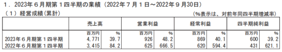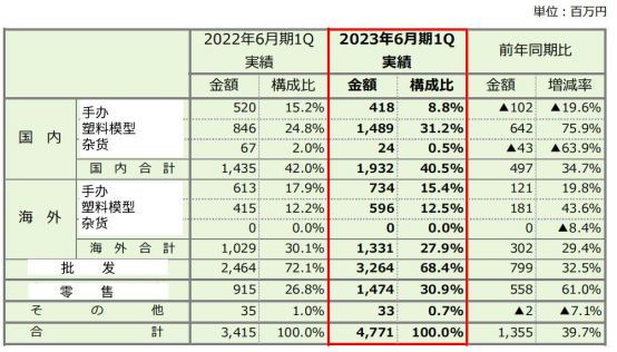 根据寿屋最新发布的2023年6月期一季度(2022.7.1-2022.9.30)财报,销售额47.71亿日元,同比增长39.7%;营业利润9.26亿日元,同比增长48.2%;当期纯利润6亿日元,同比增长39.2%。全面增收增益。