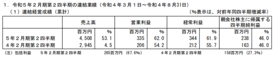 2023年2月期二季度(2022.3.1-2022.8.31),SK Japan销售额为45.08亿日元,同比增长53.1%;营业利润3.35亿日元,同比增长62%;归属股东当期纯利润2.38亿日元,同比增长46%。实现全面增收增益。