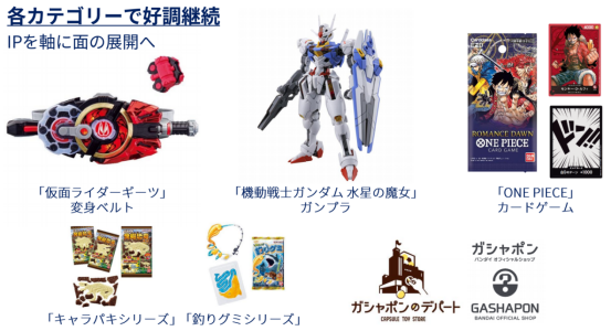 以BANDAI SPIRITS的“一番签”为首的面向便利店的抽奖相关商品表现依旧良好,《海贼王》《精灵宝可梦》《决斗大师》等集换式卡牌游戏大受欢迎,且维持了适当的库存减少了库存评估损失,销售额、利润均超过去年同期。
