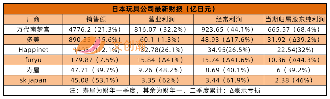 近日,万代南梦宫、多美、Happinet、Furyu、寿屋、SK Japan等几家主营业务含玩具的日本公司先后披露了最新季度的财务营收数据。