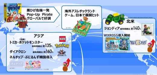 多美的动作玩具方面,积极开发4月播出的动画《盖帽革命 瓶盖人DX》的新产品;9月,迎来20周年的卡牌游戏《决斗大师》时隔6年再次更新电视动画,强化了相关产品的营销;《变形金刚》向北美及亚洲的出口增加。此外《战斗陀螺》热度下降。