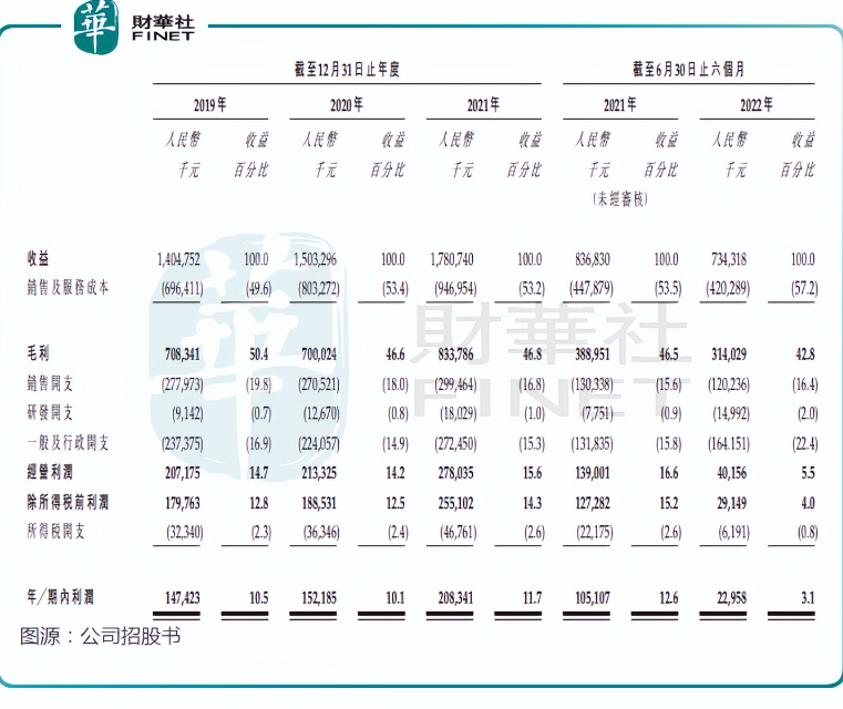 然而,疫情的冲击下,贝黎诗经营业绩并不理想,2020年及2022年上半年营收出现了较大幅度下滑,同时毛利率亦大幅下滑,2022年上半年仅为16.9%,而2019年毛利率达42.7%。