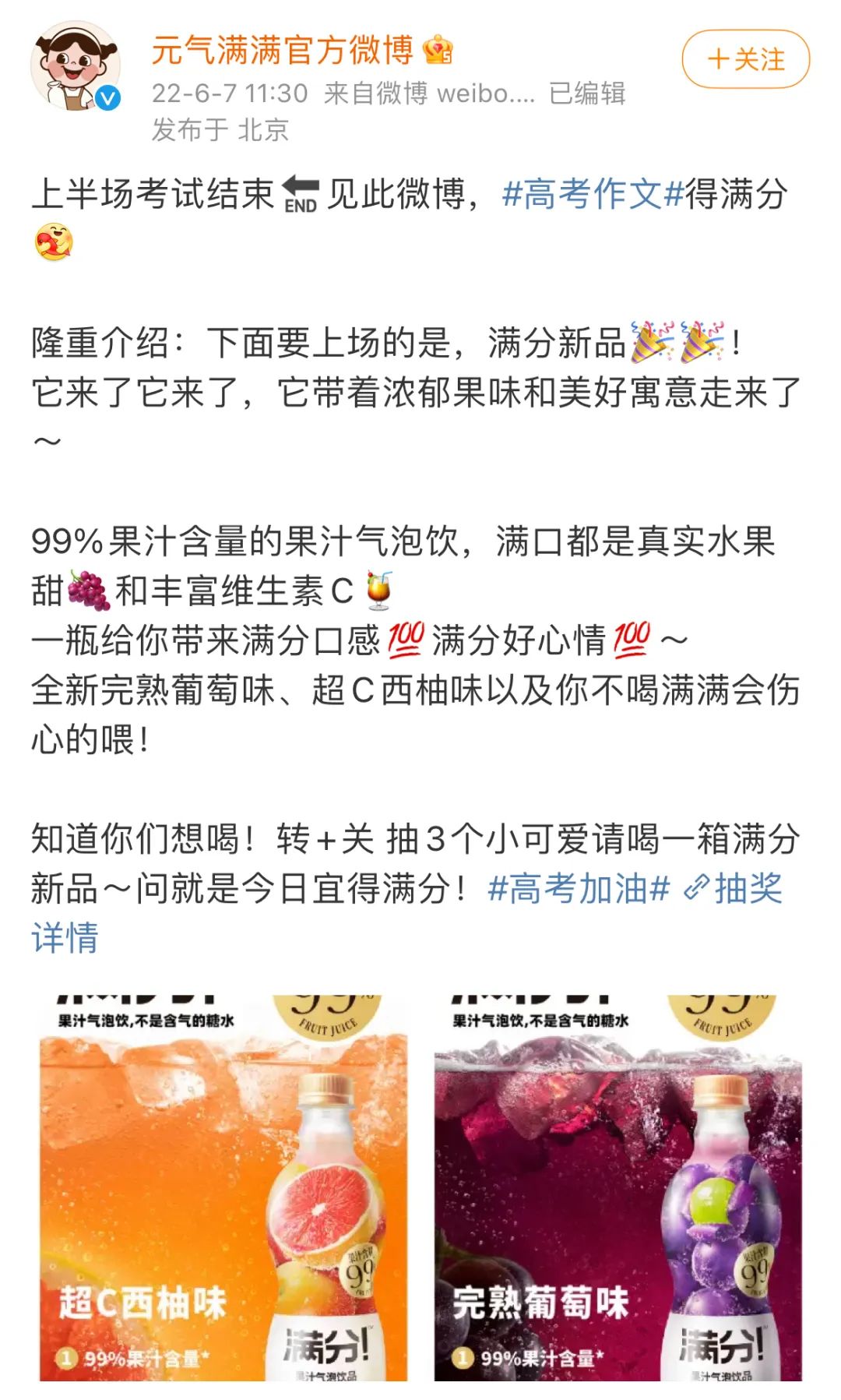 今年6月,满分悄悄在“元气满满”官方账号走起“支线剧情”。“元气满满官方微博”宣布推出满分新品“超C西柚味”和“完熟葡萄味”,同时在“元气满满旗舰店”低调上线新品。