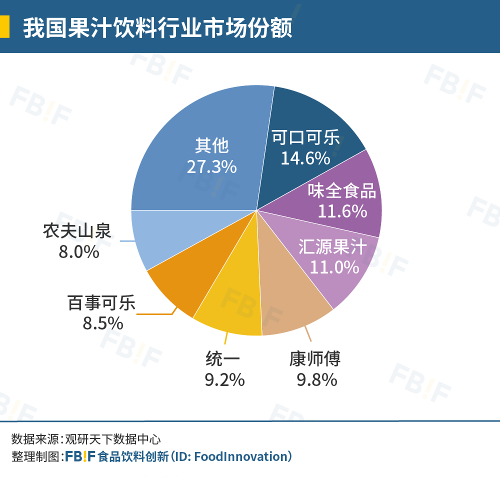 在整个中国饮料市场,果汁份额正在逐渐缩小。中国饮料协会公布的数据显示,到了2020年,中国饮料市场开始呈现以包装饮用水、即饮茶饮料和碳酸饮料为主的新格局,果汁饮料被挤出前三。