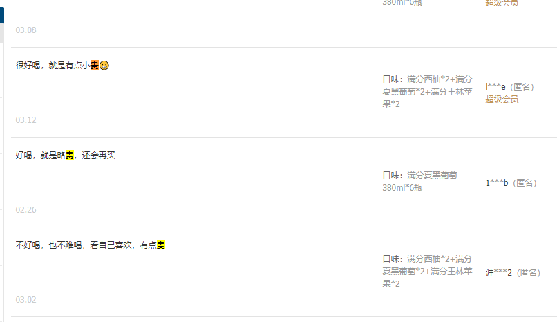 可这样真的能将满分的价值传递给消费者吗?我们发现,有部分购买满分的消费者,认为还是之前标注多种营养成分的包装更有价值感。他们选择满分,就是因为传统果汁汽水不含各类维生素,且果味来源于添加剂而非真实果汁。