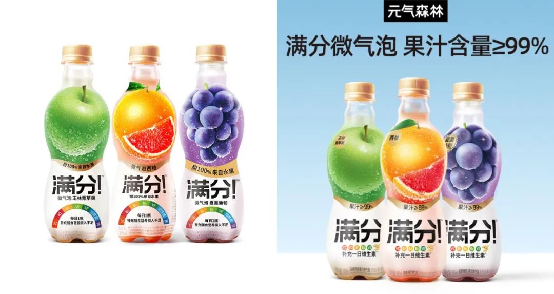 满分选择将“果汁含量99%”的图案放大;又从在瓶身上半部分放一个橙子、一串葡萄,改为在整个包装上堆满水果图案;还在白底文字部分,删去了所有对多种维生素的宣传,改为强调“果汁气泡饮品”。