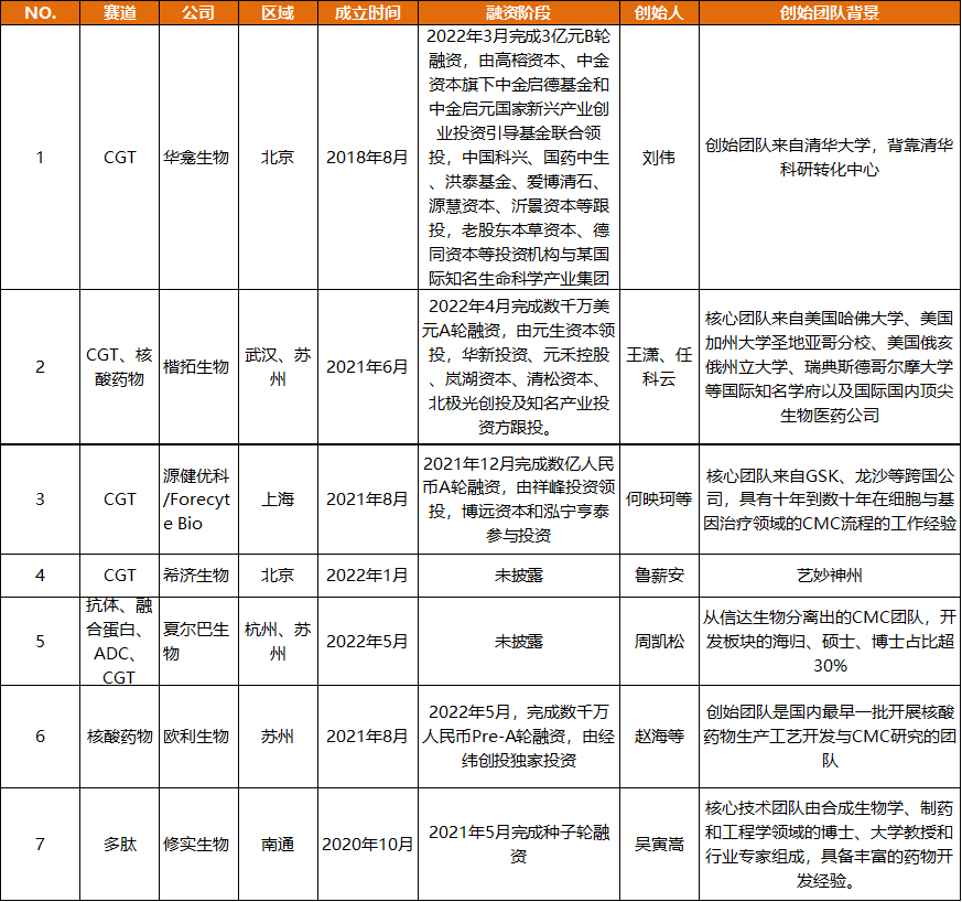 多肽与核酸药物赛道的初创CDMO企业,目前还处于起步阶段,修实生物最新披露的融资轮次在种子轮,目前正在进行A轮融资,预计2022年底完成;欧利生物则完成了Pre-A轮融资。