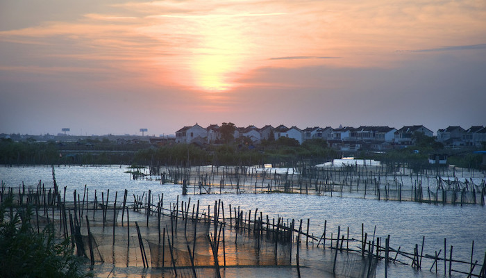 阳澄湖位于苏州的市郊,是太湖平原上的第三大淡水湖,骑自行车环湖需要一整天的时间,离上海很近,距离虹桥机场只有30分钟的车程,因为水质好,水浅而土质较硬,这里的大闸蟹肉肥味美,是中国最著名的蟹产地,每年产量在2300吨左右。