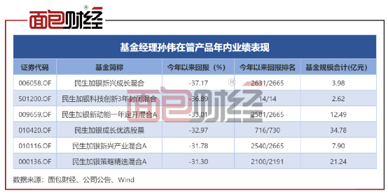 截至2022年三季度末,孙伟共管理6只公募产品,对应资产净值约83.02亿元。2022年以来,孙伟在管产品普遍回撤超过三成。