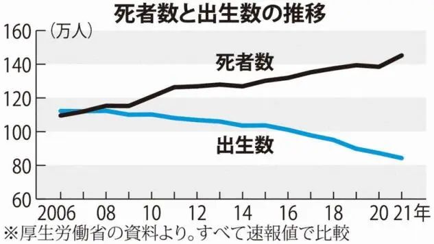 2021年,日本当年的死亡人口达到了145.22万人,而根据日本厚生劳动省的估测,日本还会在2040年迎来170万死亡人口的最高值。
