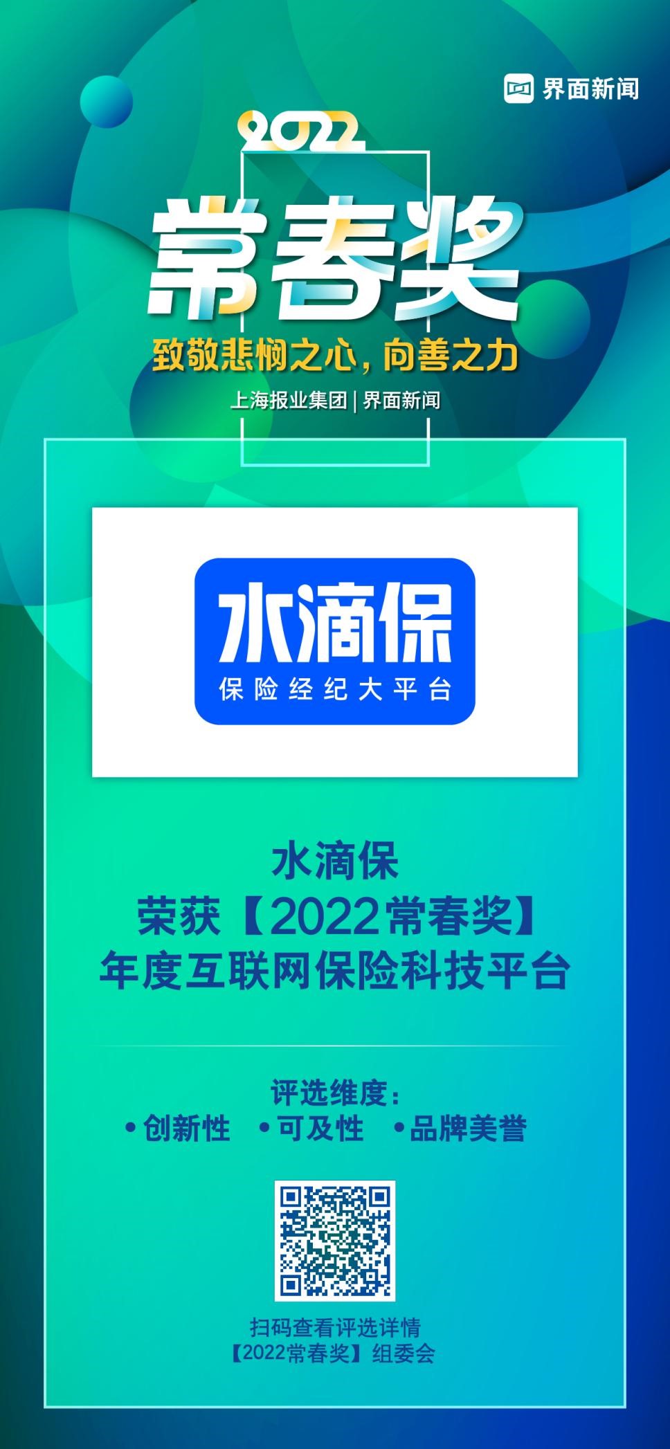 11月16日,在2022【界面大健康论坛】现场,上海报业集团l界面新闻揭晓2022【常春奖】终榜,正式公布了本年度获奖名单。聚焦大健康行业的升级和变化,综合社会各界的意见与建议,来自制药、医疗器械、药品销售、医疗服务、健康管理等领域的30家企业夺得了年度大奖。水滴保凭借高性价比的产品和极致的服务体验荣膺年度互联网保险科技平台。