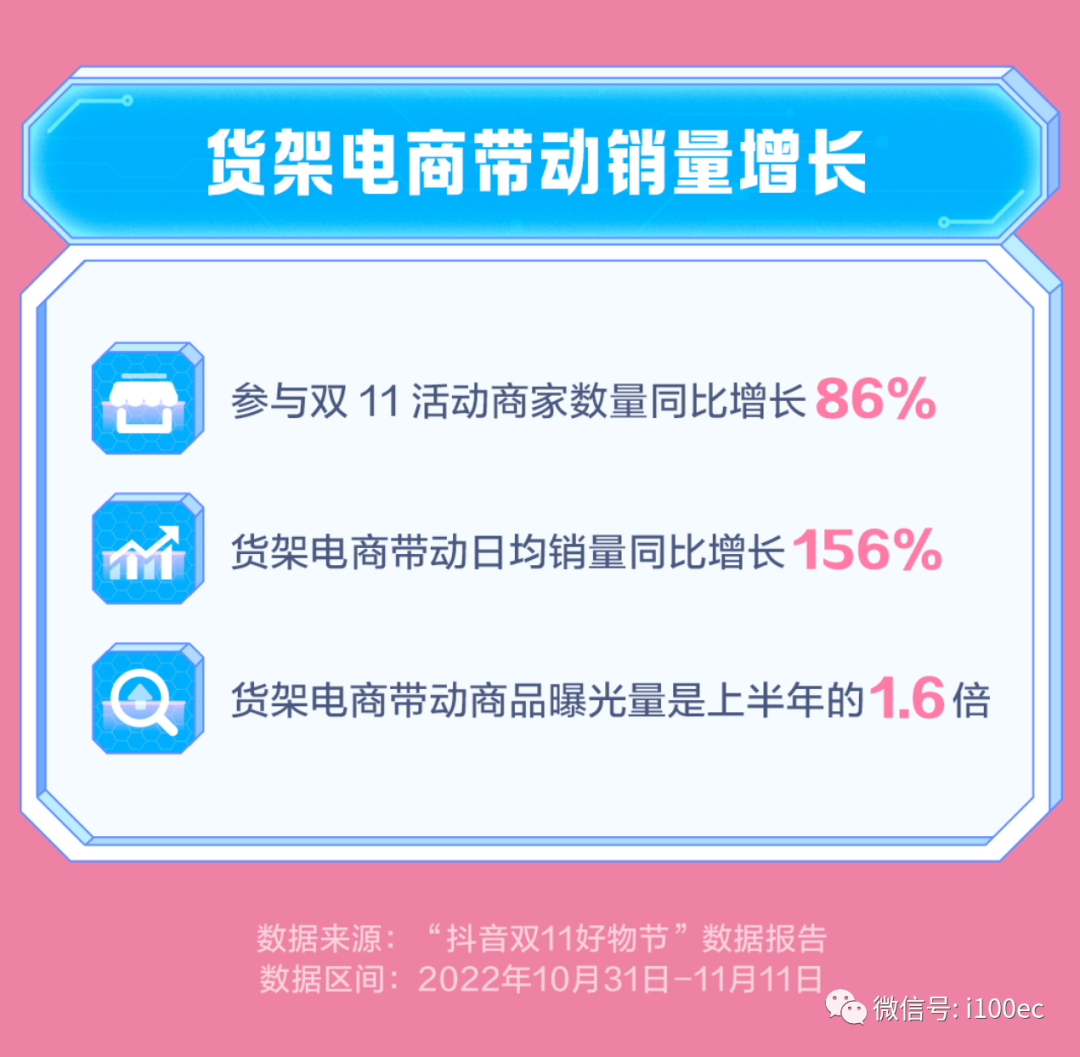 11月12日,抖音电商发布“抖音双11好物节”数据报告,报告显示,10月31日至11月11日,抖音电商内参与双11活动的商家数量同比增长了86%,兴趣电商内容带货持续发力,直播带货总时长累计达3821万小时,7667个直播间销售额超过百万元。活动期间,平台货架电商带动日均销量同比增长了156%,商品曝光量是上半年的1.6倍。