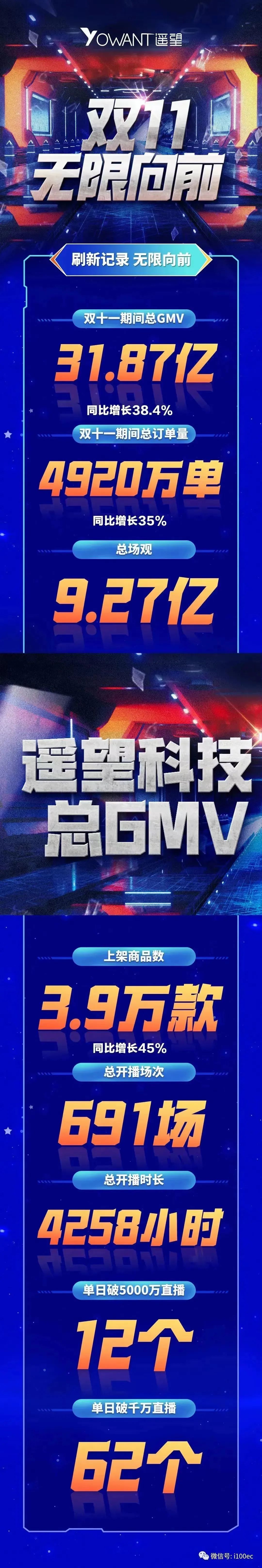 截至11月12日0时0分,遥望总GMV为31.87亿元,同比增长38.4%;共产生订单4920万单,总场观达9.27亿。期间共上架商品3.9万款,共开播691场,总开播时长达4258小时。其中,单日破5000万直播12场,单日破千万直播62场;产生GMV破千万商品18个,破500万商品56个,破百万商品403个。