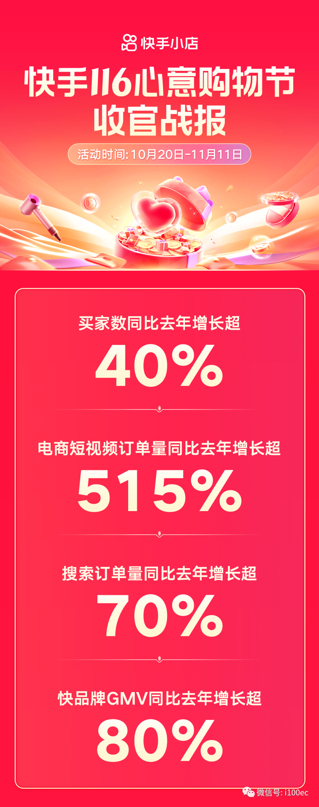 11月12日,快手发布了116心意购物节(以下简称快手116)数据报告。报告显示,今年116期间(10月20日-11月11日),电商短视频订单量增速显著,同比去年增长超515%。买家数同比去年增长超40%,搜索订单量同比去年增长超70%。快品牌表现突出,GMV同比增长超80%。