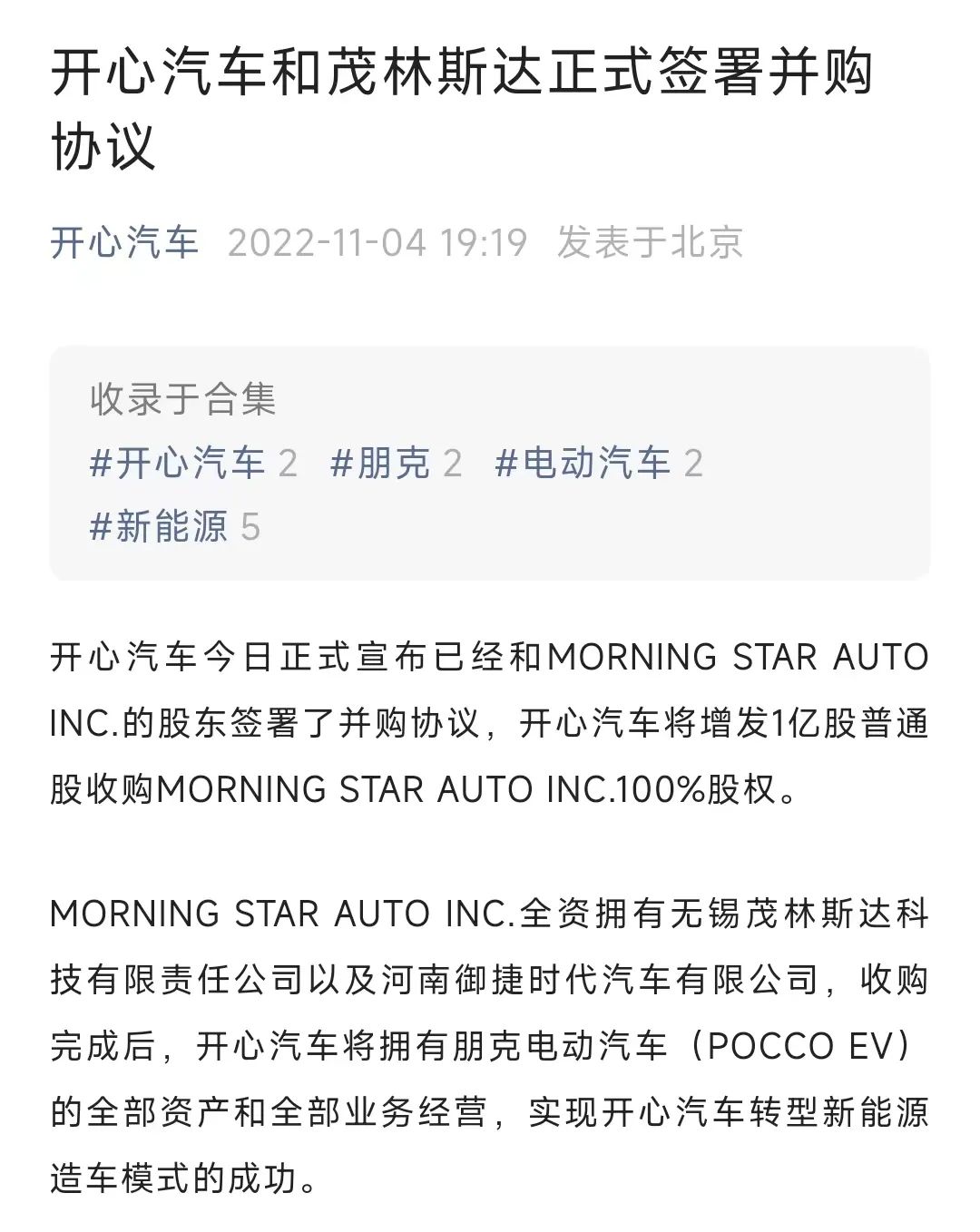 开心汽车收购公告,截图自开心汽车官方公众号