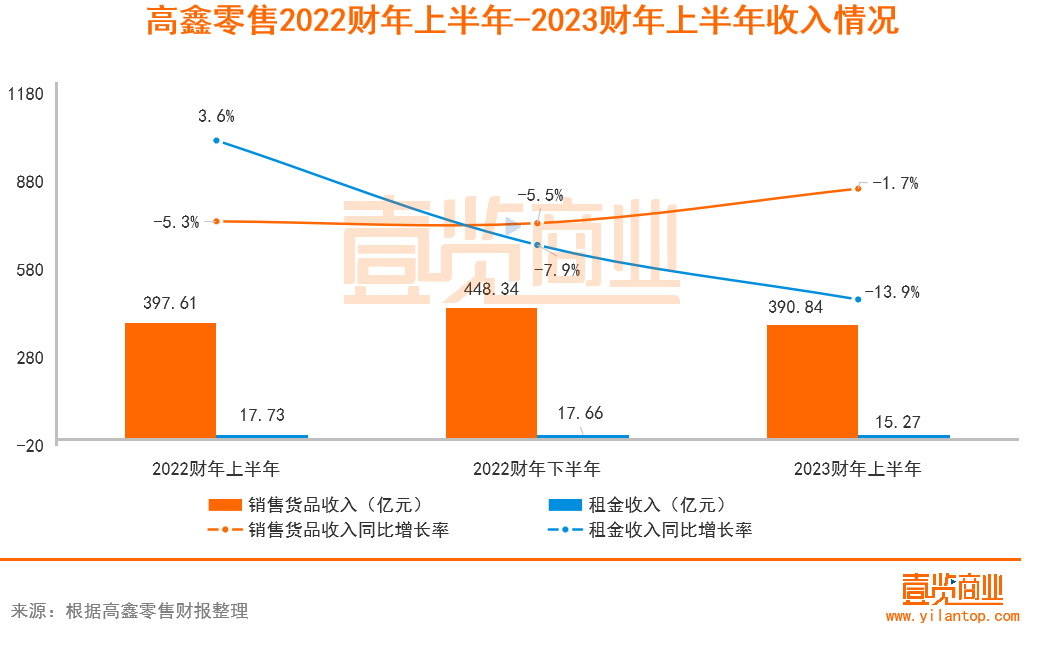 高鑫零售的营收主要分为商品销售收入和租金收入。2023财年上半年,高鑫零售营收406.11亿元,同比下滑2.2%。其中,商品销售收入390.84亿元,同比下跌1.7%,与去年同期基本持平。在今年的经济形势下,这一数据在商超行业中表现还不错。