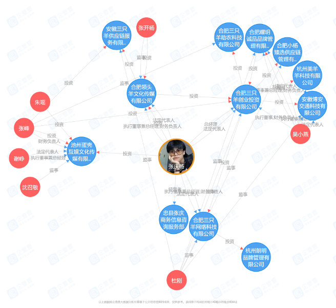 目前,张庆杨旗下关联企业有7家,在合肥三只羊创业投资有限公司、合肥三只羊网络科技有限公司、合肥领头羊文化传媒有限公司中担任法定代表人、执行董事、财务负责人等职位。