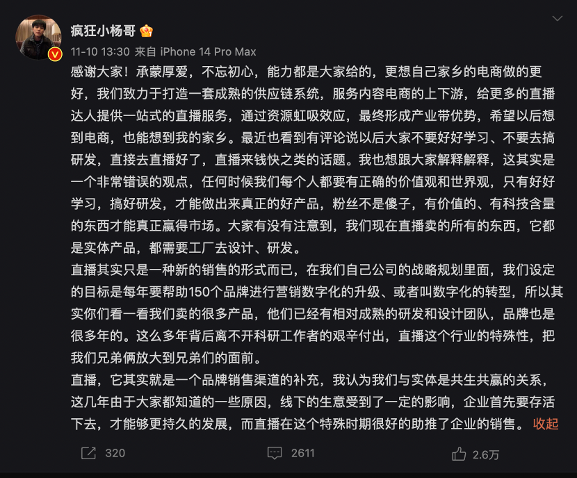 11月10日,小杨哥的官方微博发布了一条长文,文中直接回应了他为何要花1亿元购买大楼的原因:“能力都是大家给的,更想自己家乡的电商做的更好,我们致力于打造一套成熟的供应链系统,服务内容电商的上下游,给更多的直播达人提供一站式的直播服务,通过资源虹吸效应,最终形成产业带优势,希望以后想到电商,也能想到我的家乡。”