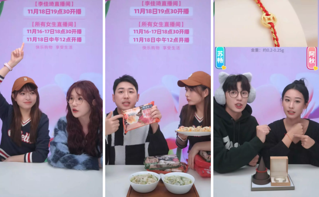 与此同时,他的另一位副播庆子却出现在一个新的淘宝直播间“所有女生”,一口气给粉丝送出40多件0.01元的秒杀福利。当晚,两个直播间还连麦PK,这样的画面,在淘宝直播并不常见。