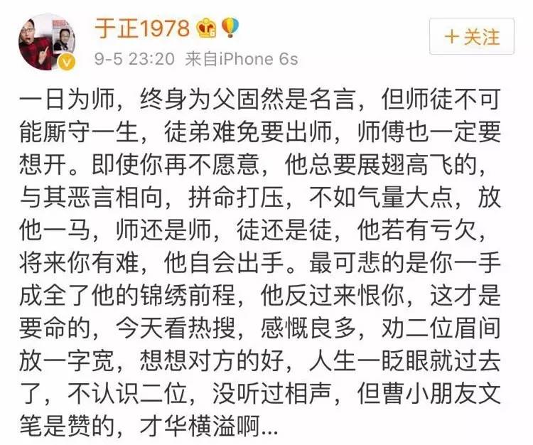 然后于妈还出来瞎凑了个热闹,说:“一日为师,终身为父固然是名言,但师徒不可能厮守一生,徒弟难免要出师,师傅也一定要想开。即使你再不愿意,他总要展翅高飞的,与其恶言相向,拼命打压,不如气量大点,放他一马,师还是师,徒还是徒,他若有亏欠,将来你有难,他自会出手。最可悲的是你一手成全了他的锦绣前程,他反过来恨你,这才是要命的,今天看热搜,感慨良多,劝二位眉间放一字宽,想想对方的好,人生一眨眼就过去了,不认识二位,没听过相声,但曹小朋友文笔是赞的,才华横溢啊…”