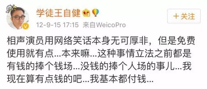王自健就发微博说:“相声演员用网络笑话本身无可厚非,但是免费使用就有点……”