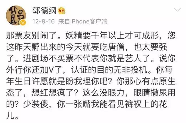 没想到郭德纲把自己的骂人功夫发挥得淋漓尽致,在微博上直接喊话:“那票友别闹了。妖精要千年以上才可成形,您这昨天孵出来的今天就要吃唐僧,也太要强了。进剧场不买票不代表你就是艺人了。说你外行你还加V了,认证的目的无非投机。你每年生日许愿就是盼我理你吧?你那心有点原生态了,想红想疯了?这么没眼力,眼睛撒尿用的?少装傻,你一张嘴我能看见裤衩上的花儿。”