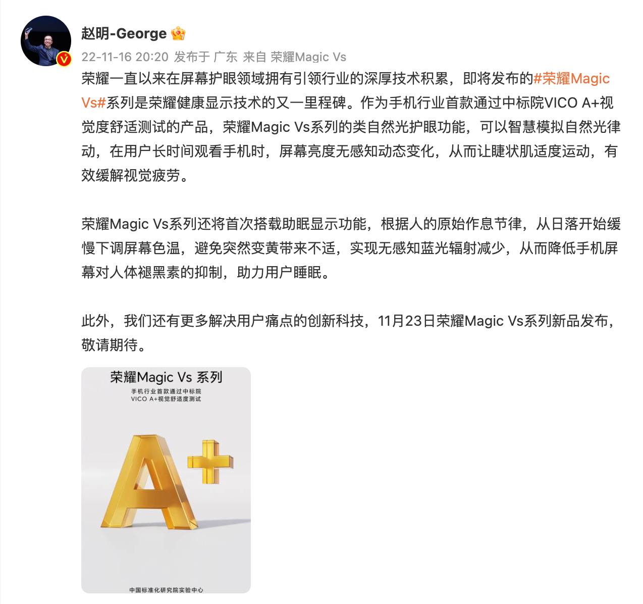 近日,荣耀终端CEO赵明微博宣布了荣耀Magic Vs系列,在健康显示方面的极大进展:最新的荣耀Magic Vs在屏幕显示方面再度创新,成为行业内首款通过中标院VICO A+舒适认证的手机。全新的类自然光护眼功能与助眠显示功能,以科技为人的理念消费者带来更健康的手机使用体验。