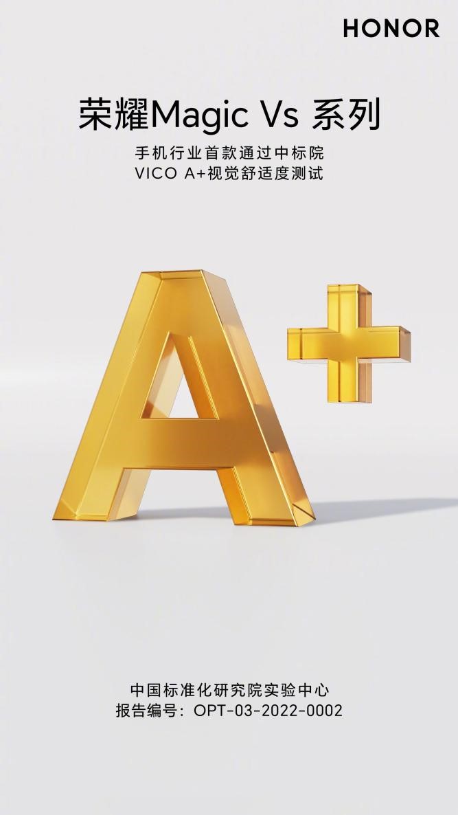 类自然光护眼功能的研发,更是让荣耀Magic Vs通过了中国标准化研究院实验中心 VICO 的A+舒适性认证,成为荣耀健康显示技术的又一里程碑。