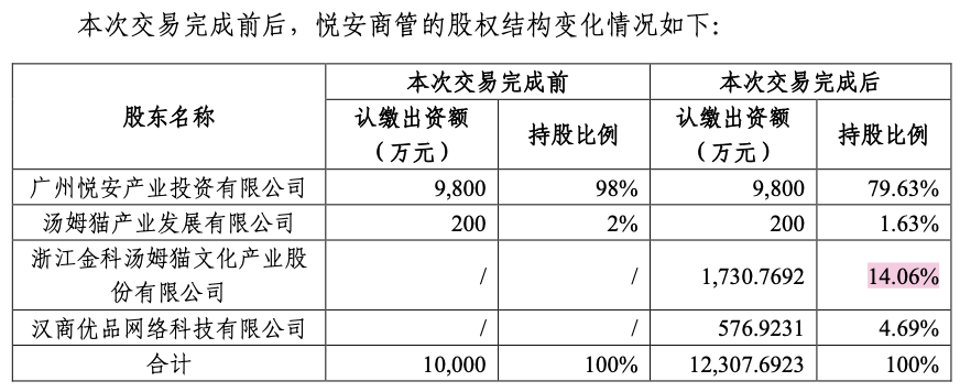 若本次交易完成,汤姆猫、汉商优品将分别持有悦安商管14.06%、4.69%的股份。