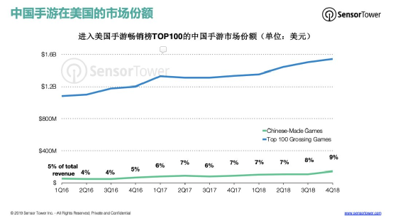 在美国手游畅销榜Top100中,中国手游市场份额占比逐年递增,至2018年Q4已经达到9%。从不到5%晋升到9%,虽然看似增长比例不大,但是这种进步却并不仅仅意味着营收的增加,而是为后续进入北美市场的出海厂商们提供了更多的有利帮助。