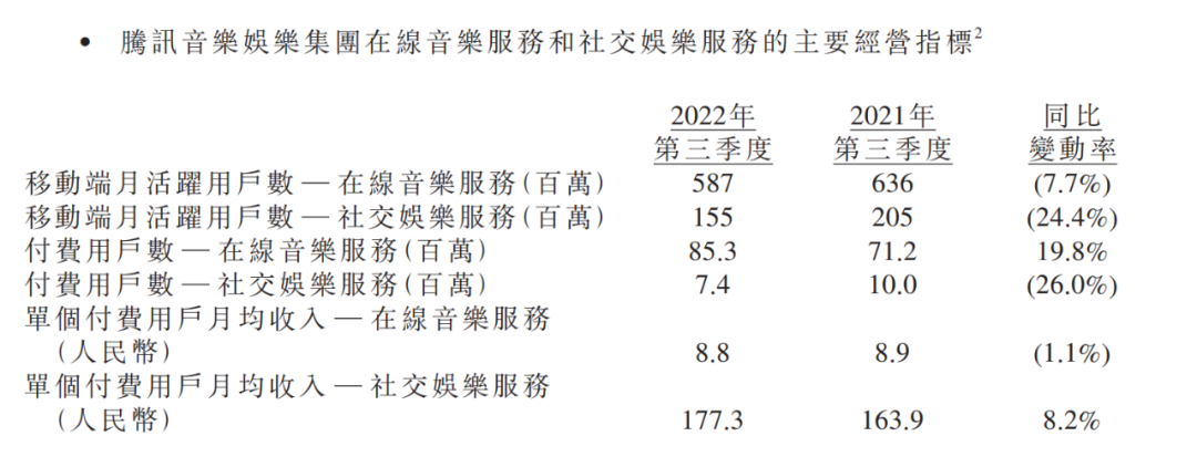 三季度,腾讯音乐在线音乐付费用户数环比净增260万至8530万人,与此同时,三季度单个付费用户月均收入为8.8元,与去年同期的8.9元相比基本保持稳定,这带动在线音乐订阅收入同比增长18.3%至22.5亿元,推动了在线音乐整体业绩回升。